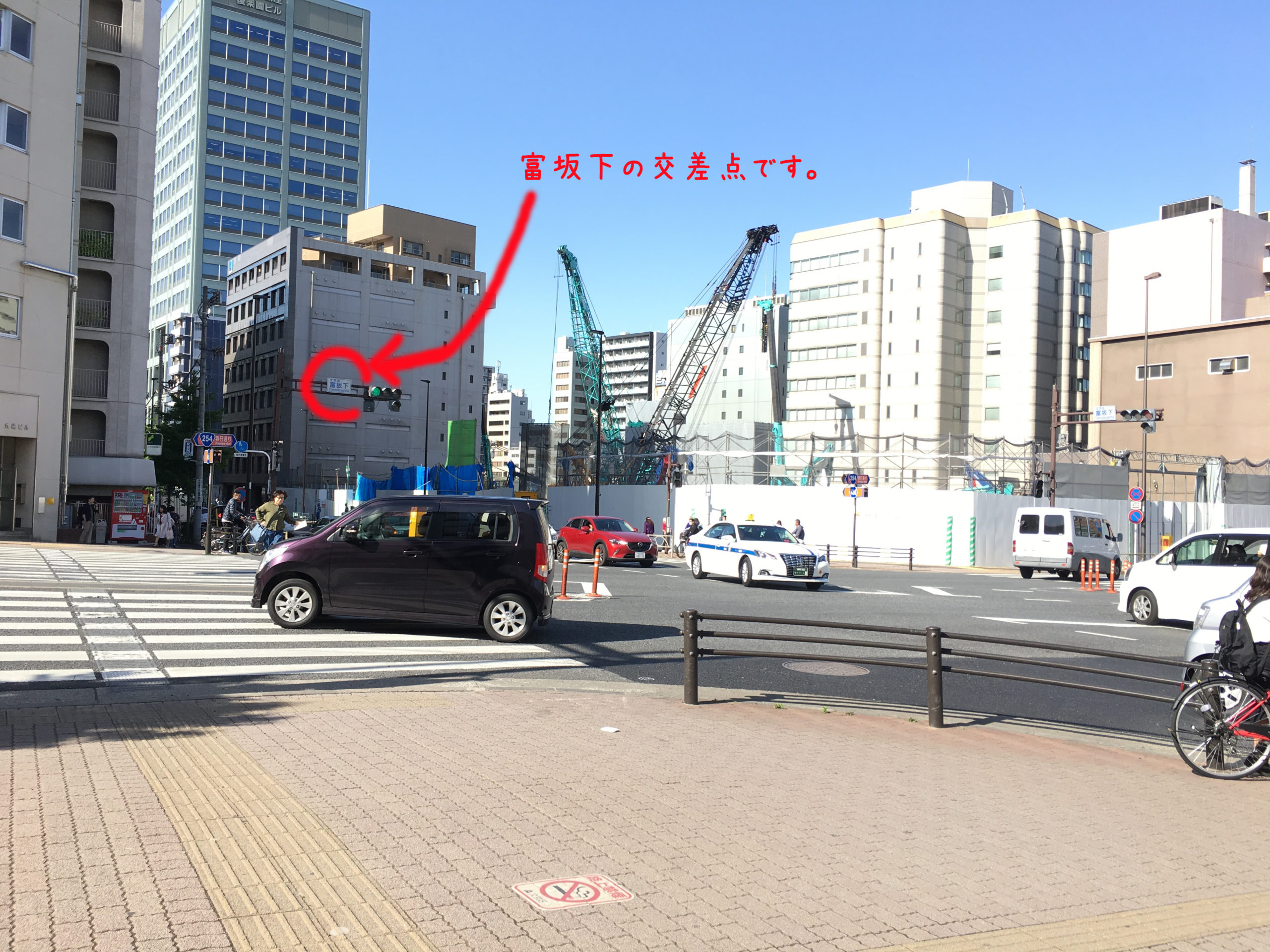 【2】すぐに富坂下(とみさかした)の交差点が見えてきます。