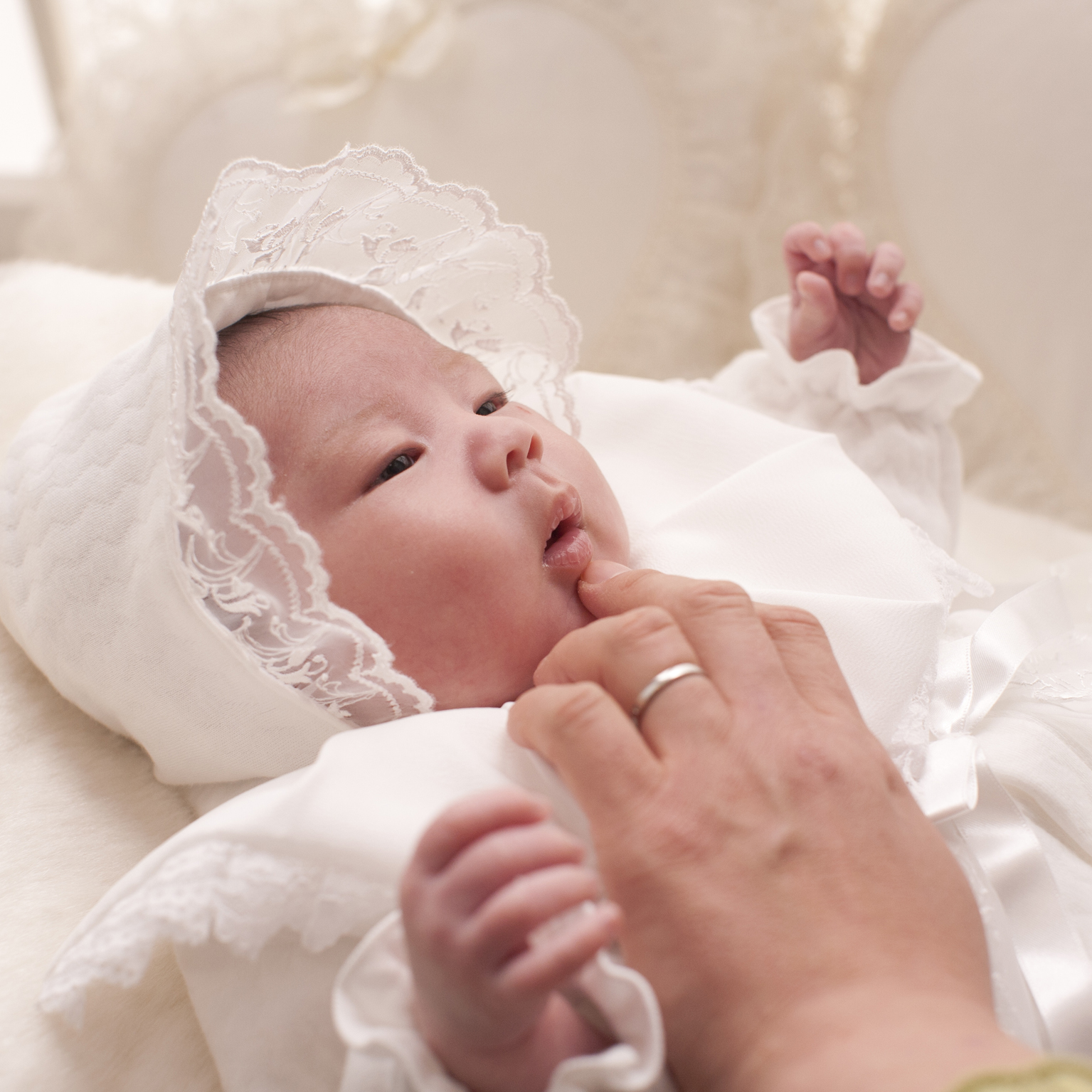 お宮参りへ行く当日ならセレモニードレスと呼ばれる白いレースの生地のものが多く見られますね。